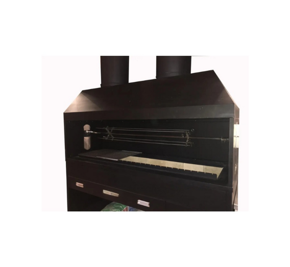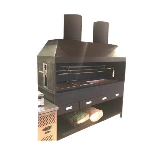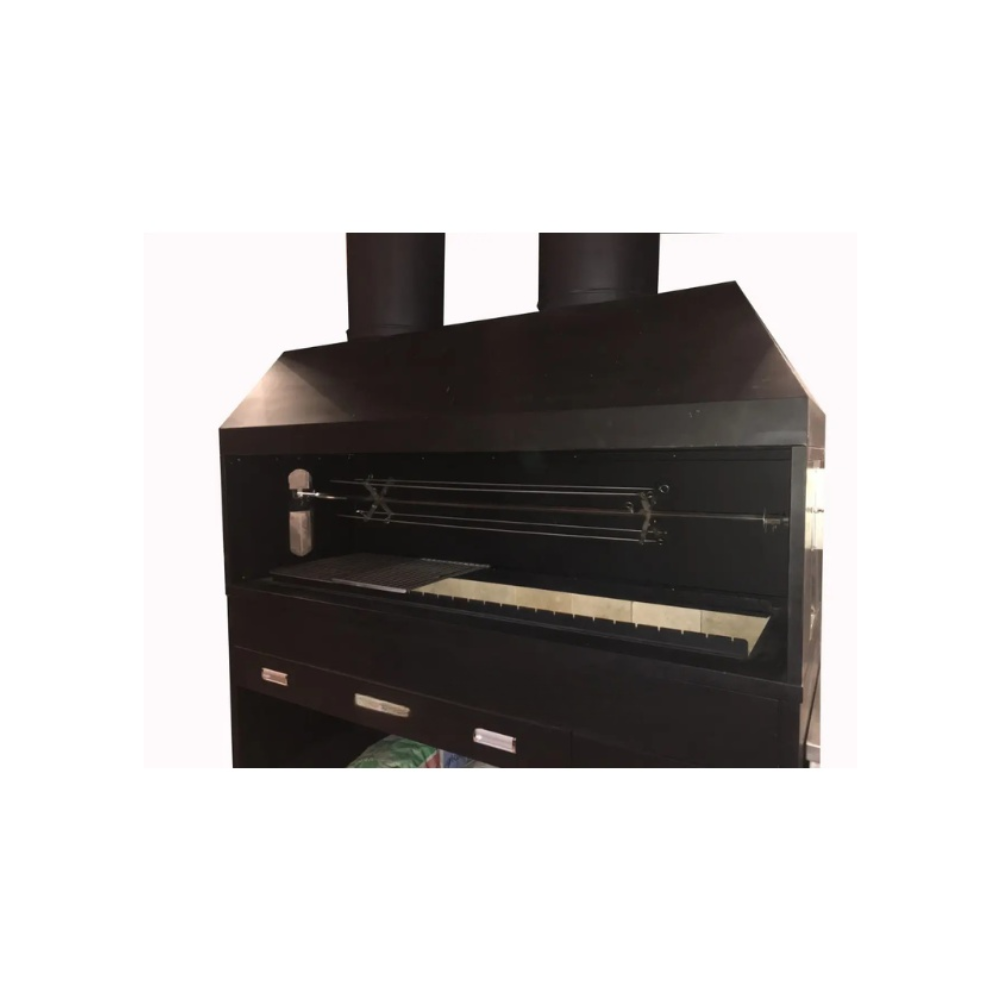 This professional grill is ideal for heavy-duty use in restaurants, cafes, or private events. It features skewers, an exhaust hood, and three-sided cladding with four drawers for convenient operation. The entire cooking area is lined with fireclay bricks, ensuring excellent heat insulation and durability.