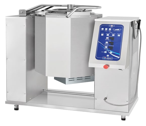 The volume of the boiling pan is 160 liters. The boiling pan is equipped with a mixer for mixing the products being cooked. The mixer has regulable speed of rotation and a reverse mode. The products can be prepared as with mixing so without it. The device features a program control unit (99 four-stage programs), the option of regulation the temperature of a “steam water jacket” within +3...+120 °C range and time of cooking. In case if there is no water in the “steam water jacket” the heating will stop automatically. The product being prepared can be cooled by the way of cooling the “water steam jacket” by cold lotic water. The boiling pan is equipped with a hand shower. The drain of the readymade product is done by electric drive tilt of the boiling pan reservoir. The facing of the boiling pan is done from stainless steel AISI 304, the bowl - from stainless steel AISI 316. The boiling pan support is to be mounted to the floor surface either by encasing in concrete or with the help of anchor bolts.