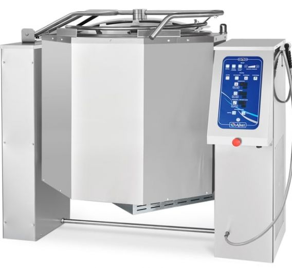 The volume of the boiling pan is 250 liters. The boiling pan is equipped with a mixer for mixing the products being cooked. The mixer has regulable speed of rotation and a reverse mode. The products can be prepared as with mixing so without it. The device features a program control unit (99 four-stage programs), the option of regulation the temperature of a “steam water jacket” within +3...+120 °C range and time of cooking. In case if there is no water in the “steam water jacket” the heating will stop automatically. The product being prepared can be cooled by the way of cooling the “water steam jacket” by cold lotic water. The boiling pan is equipped with a hand shower. The drain of the readymade product is done by electric drive tilt of the boiling pan reservoir. The facing of the boiling pan is done from stainless steel AISI 304, the bowl - from stainless steel AISI 316. The boiling pan support is to be mounted to the floor surface either by encasing in concrete or with the help of anchor bolts.