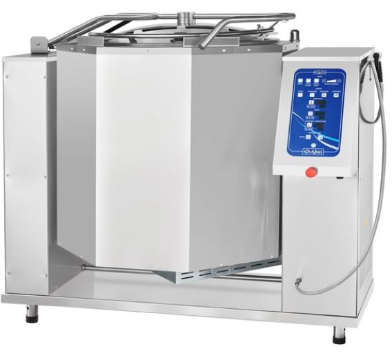 The volume of the boiling pan is 350 liters. The boiling pan is equipped with a mixer for mixing the products being cooked. The mixer has regulable speed of rotation and a reverse mode. The products can be prepared as with mixing so without it. The device features a program control unit (99 four-stage programs), the option of regulation the temperature of a “steam water jacket” within +3...+120 °C range and time of cooking. In case if there is no water in the “steam water jacket” the heating will stop automatically. The product being prepared can be cooled by the way of cooling the “water steam jacket” by cold lotic water. The boiling pan is equipped with a hand shower. The drain of the readymade product is done by electric drive tilt of the boiling pan reservoir. The facing of the boiling pan is done from stainless steel AISI 304, the bowl - from stainless steel AISI 316. The boiling pan support is to be mounted to the floor surface either by encasing in concrete or with the help of anchor bolts.