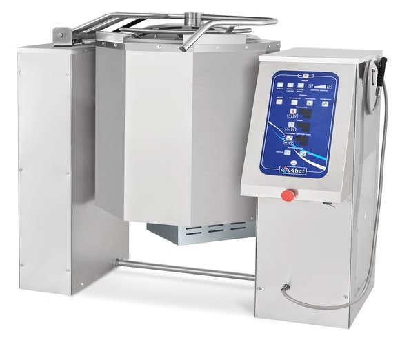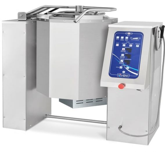 The volume of the boiling pan is 60 liters. The boiling pan is equipped with a mixer for mixing the products being cooked. The mixer has regulable speed of rotation and a reverse mode. The products can be prepared as with mixing so without it. The device features a program control unit (99 four-stage programs), option of regulation the temperature of a “steam water jacket” within +3...+120 °C range and time of cooking. In case if there is no water in the “steam water jacket” the heating will stop automatically. The product being prepared can be cooled by the way of cooling the “water steam jacket” by cold lotic water. The boiling pan is equipped with a hand shower. The drain of the readymade product is done by electric drive tilt of the boiling pan reservoir. The facing of the boiling pan is done from stainless steel AISI 304, the bowl - from stainless steel of AISI 316. The boiling pan support is to be mounted to the floor surface either by encasing in concrete or with the help of anchor bolts.
