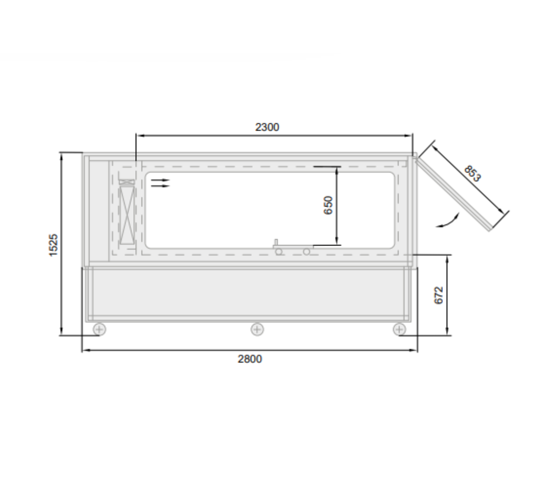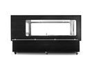 Katafalque cooler. Equipped with glazed side walls, a lift-up glass lid on actuators, LED lighting, and wheels for mobility. Stainless steel construction with wood-effect exterior finish.