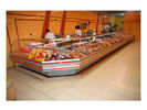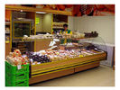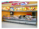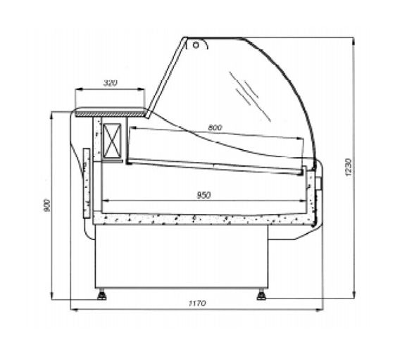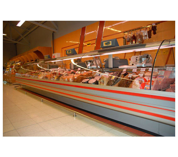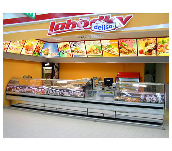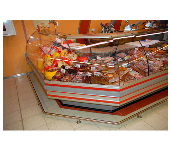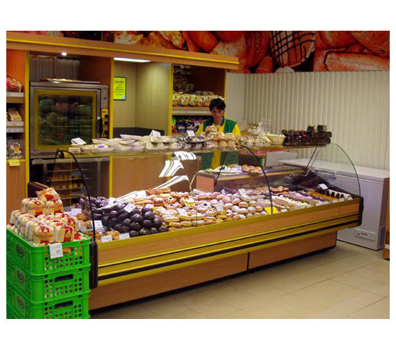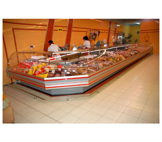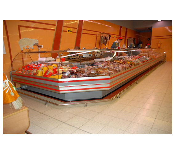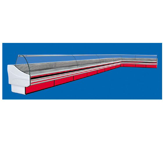 Display refrigerator with increased worktop, increased exhibition shelf and storage capacity. When used together with angular displays can be combined in lines of any configuration.