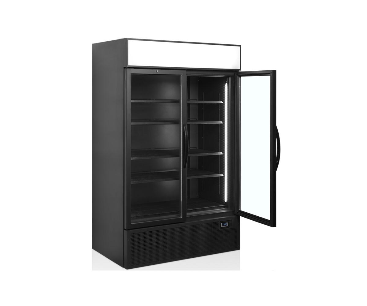 The FSC range is with a light canopy. The possibility for customized branding is eye-catching and stimulate impulse sales. The unit keeps beverages cold whilst presenting and promoting the products to their best advantage. This model is with black exterior and interior. The black exterior finish looks great, the black interior makes the content stand out - especially with LED lights perfectly illuminating the content. It is ideal for high-end cafes, delis, patisseries and in-store placement in supermarkets. It comes with 5 adjustable black wire shelves, 2 self-closing hinged glass doors, 2 vertical full-length LED lights inside the door frame and a LED light canopy.