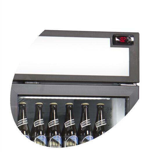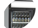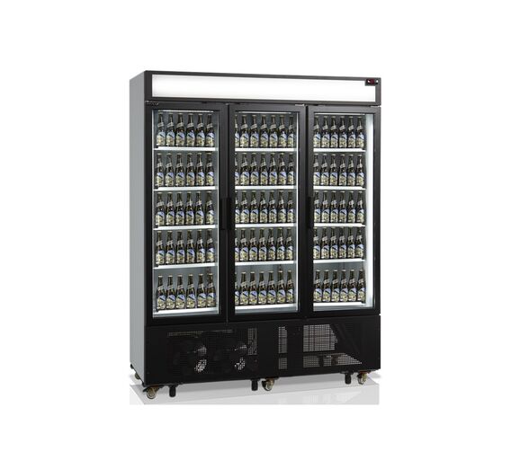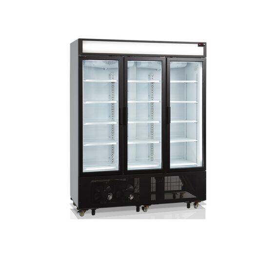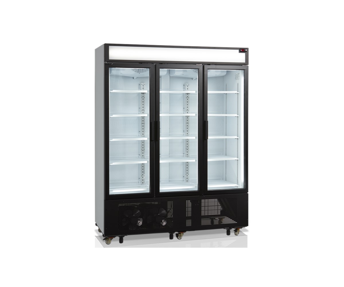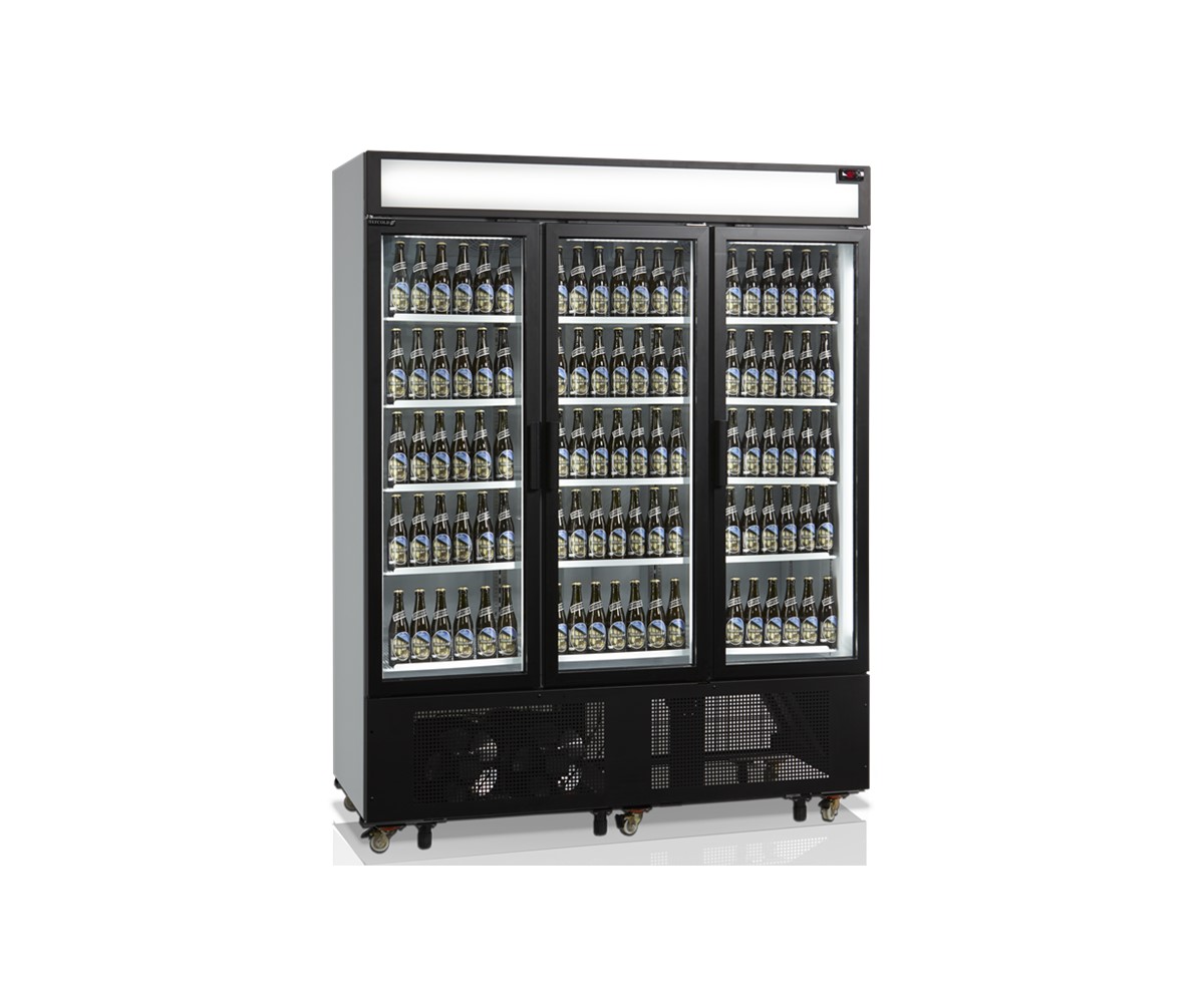 FSC1600H-P with canopy is a perfect choice for stores wanting to utilize their limited space best possible or wanting to reduce energy consumption compared to e.g. open front coolers. The spiral maintenance free condenser improves the cooling performance together with 2-layered glass and 2 internal fans. It also saves energy and means the unit requires less maintenance. Door glass, shelves, LED light in the doors and the finish in general has been improved in order to optimize the presentation of the displayed products. You can for example have different shelf positions per door instead of one big shelf - this gives a more flexible product display. Middle shelves are 535 mm wide. Side shelves in both sides are 465 mm wide. Our 3-door cooler is well suited for e.g. supermarkets, convenience stores and gas stations, and the black design and improved finish also opens up the possibility for using the cooler in restaurants, cafés or bars. FSC1600H also comes in a freezer version - UFSC1600GCP.
