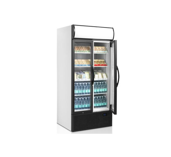 The FSC range is with a light canopy. The possibility for customized branding is eye-catching and stimulate impulse sales. The unit keeps beverages cold whilst presenting and promoting the products to their best advantage. This model is standard with white exterior and interior. It comes with 5 adjustable white wire shelves, 2 self-closing hinged glass doors, 2 vertical full length LED lights inside the door frame and a LED light canopy.