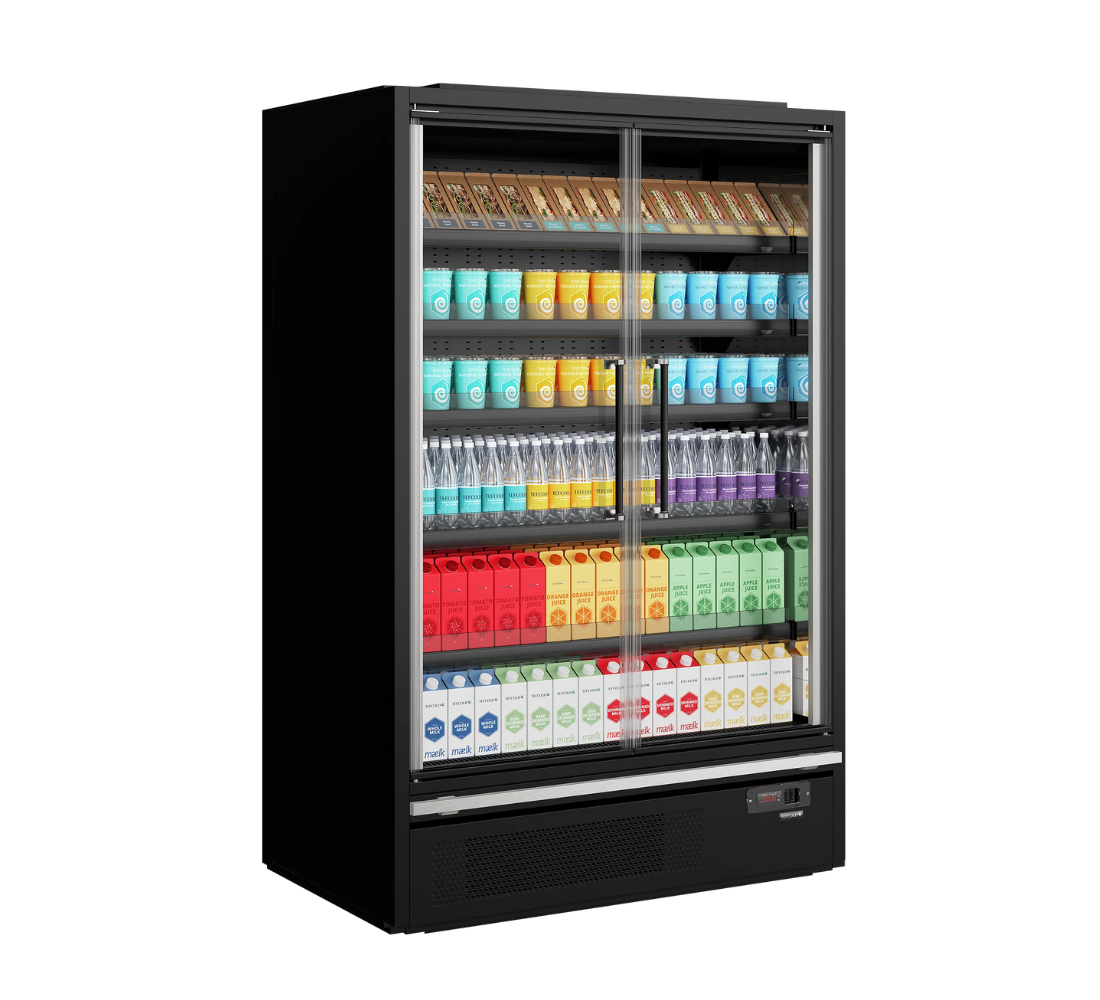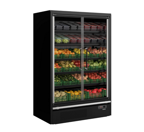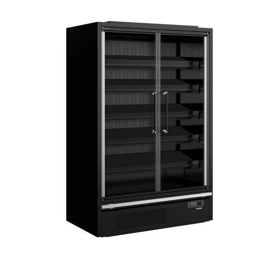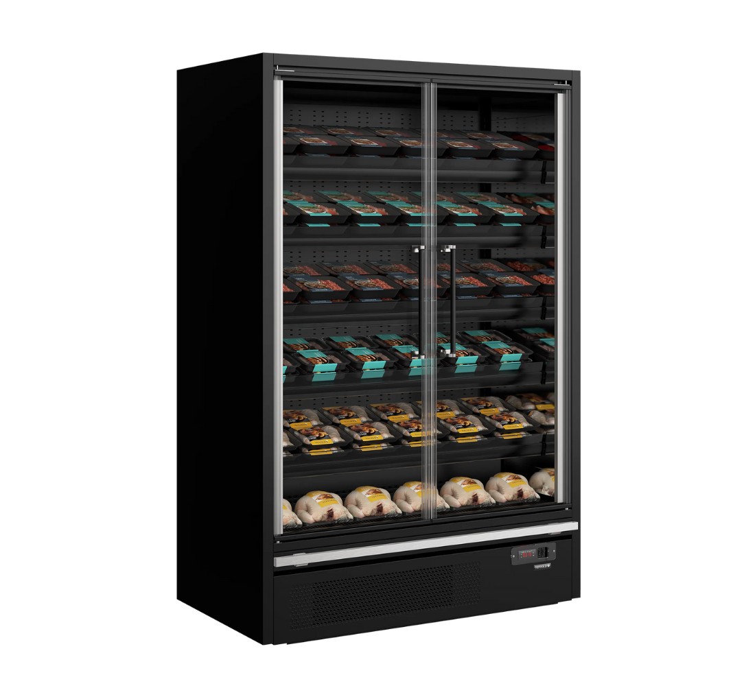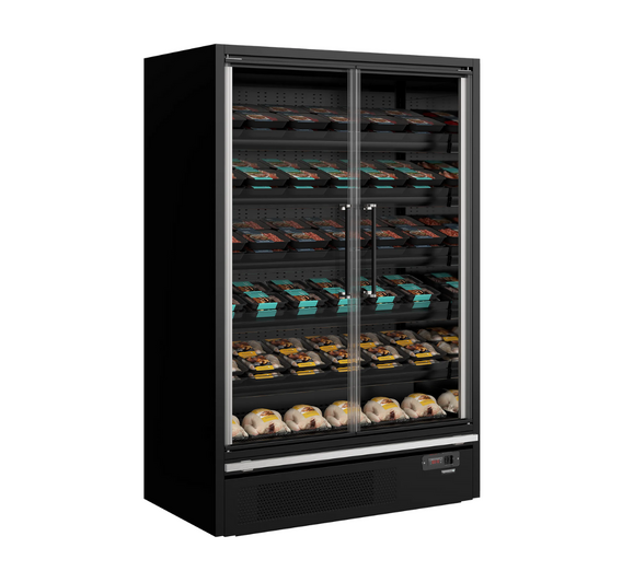 With this full glass door multideck cooler, you get a gorgeous design combined with an energy efficient cooling system. The frameless full vision glass doors allow for great visibility of the products inside. Vertical LED lights run down the inside of each wall, which combined with horizontal LED lighting across the top give excellent illumination and make the contents stand out. The shelves can be tilted to optimize product presentation. Multiplexing kits are available as accessories, so you can create uninterrupted lines throughout your store. As a result of a carefully designed refrigeration system and optimal airflow through the cooler, this cabinet has an outstanding low energy consumption and an impressive EU energy rating.