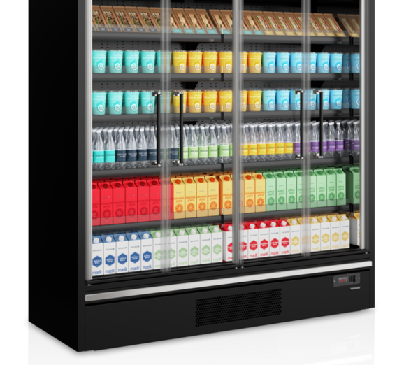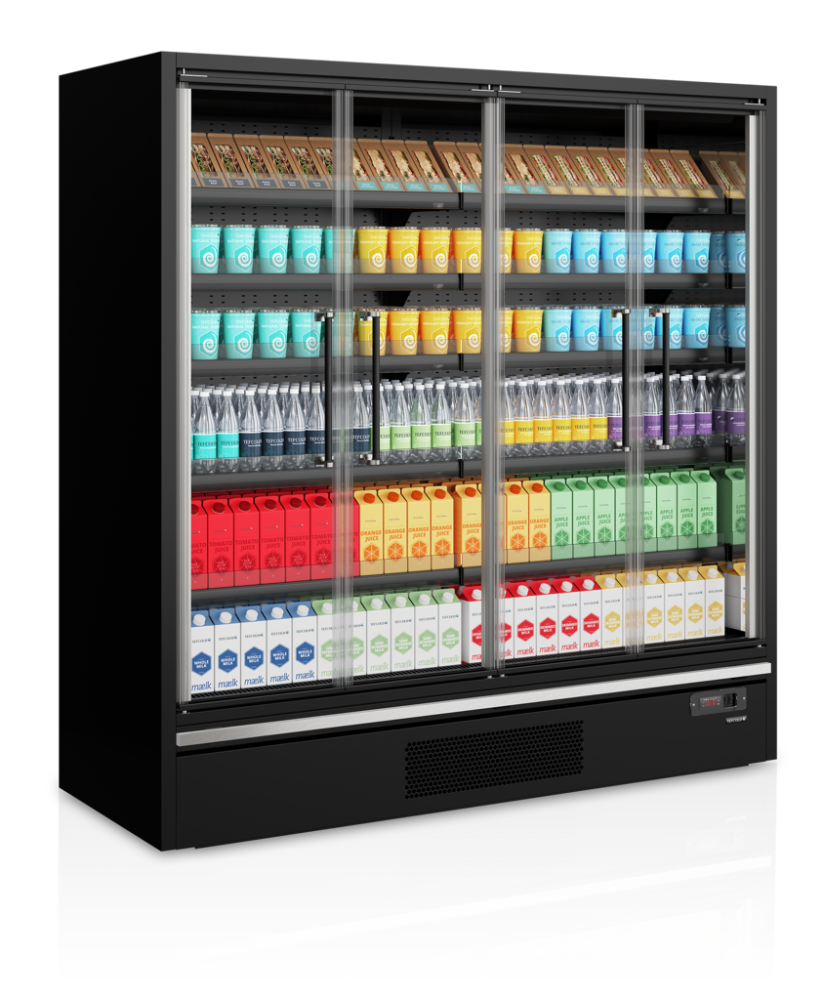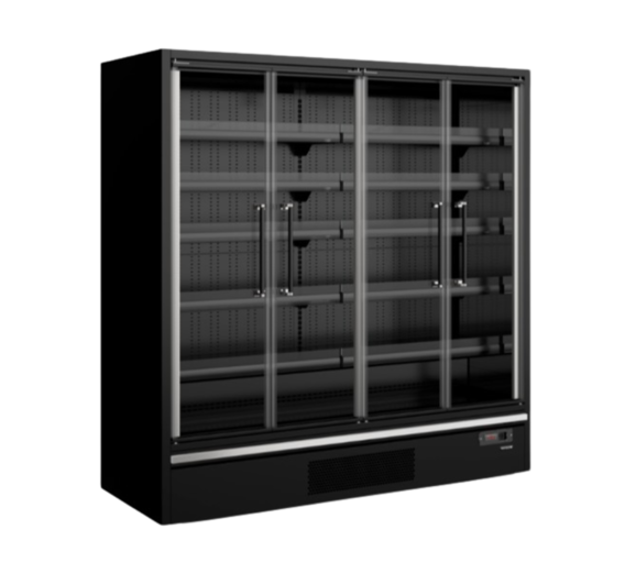 Refrigerated Multideck with glass hinged doors and built-in energy-efficient refrigeration unit.