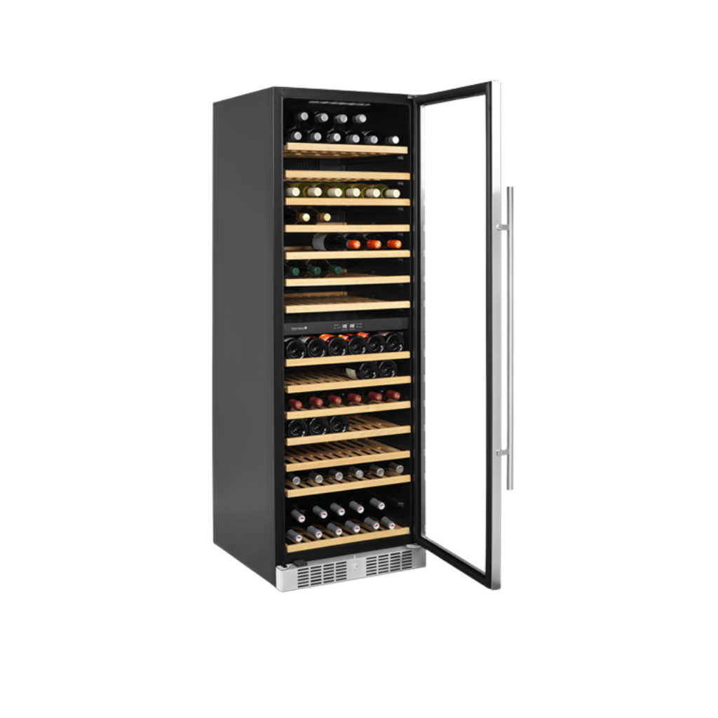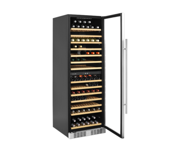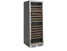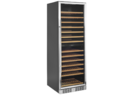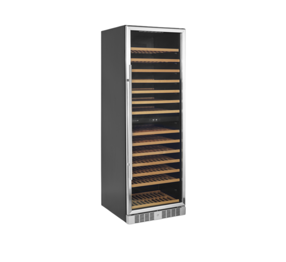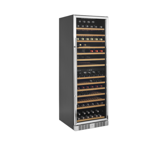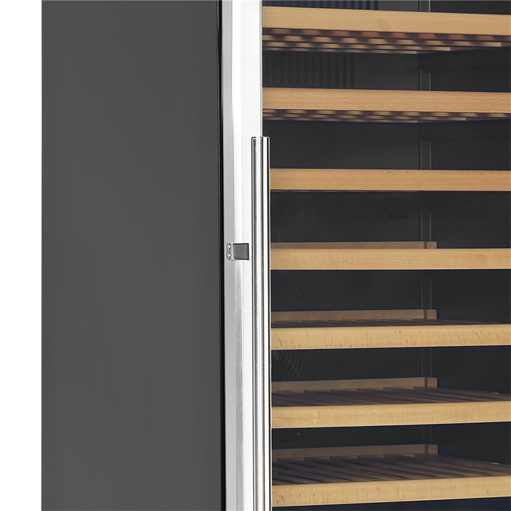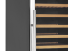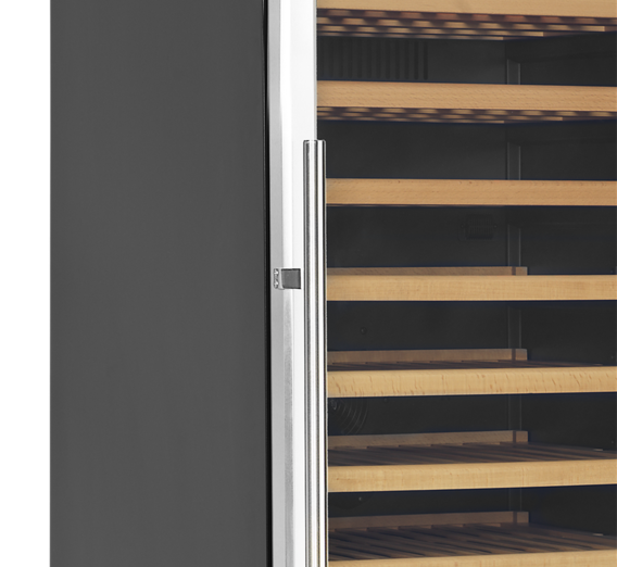 The clear glass door, the black interior and the LED lighting give the cabinet a fresh and modern look, and the slide out wooden shelves are as handsome as they are practical. In addition to the design features, the cabinet also offers a modern cooling system that reduces the heat, noise, and energy consumption of the wine cooler.