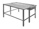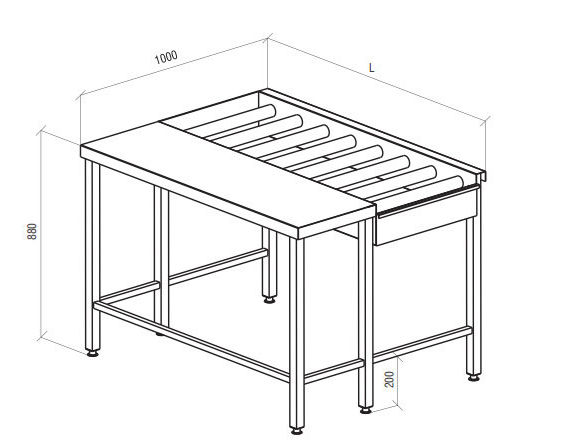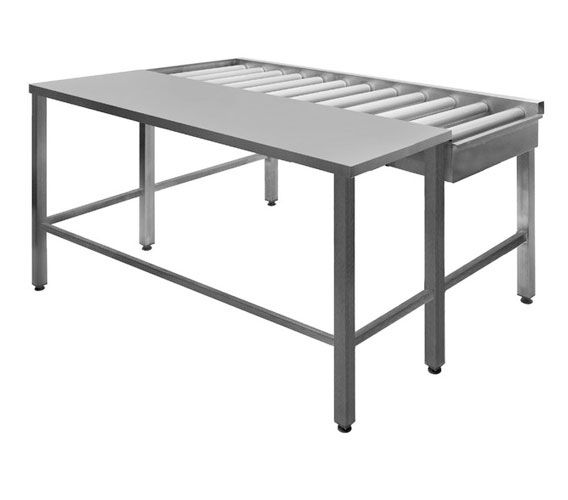 The working surface - stainless steel AISI 304. PVC rollers, gray. The legs are made of stainless steel (square tube 40x40 mm). The legs are adjustable class="card__details" in height (amplitude of 35 mm, + 25 / -10 mm). Possibility to connect to any type dishwashers.