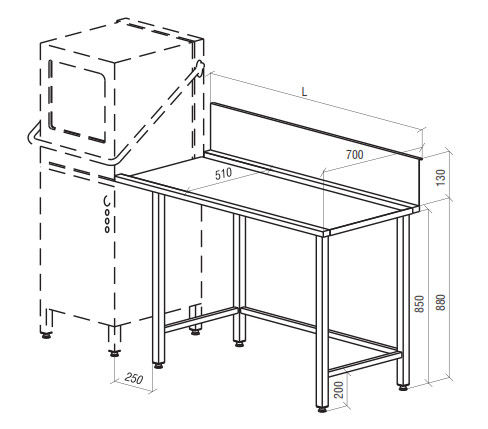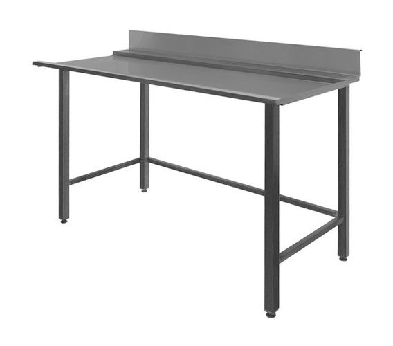 The working surface of stainless steel AISI 304. Stainless steel frame (square tube 25x25 mm). Rear rim height of 130 mm. The legs are made of stainless steel (square tube 40x40 mm). The legs are adjustable class="card__details" in height (amplitude of 35 mm, + 25 / -10 mm). Possibility to connect to any type dishwashers.