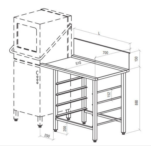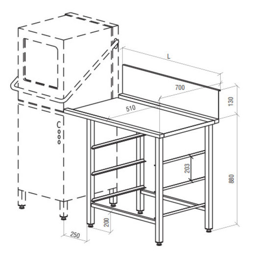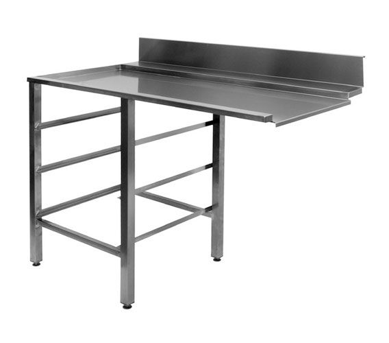 The working surface of stainless steel AISI 304. Stainless steel frame (square tube 25x25 mm). Rear rim height of 130 mm. Guides for 3 or 4 dishwasher baskets (500x500 mm) of stainless steel AISI 304. The legs are made of stainless steel (square tube 40x40 mm). The legs are adjustable class="card__details" in height (amplitude of 35 mm, + 25 / -10 mm). Possibility to connect to any type dishwashers.