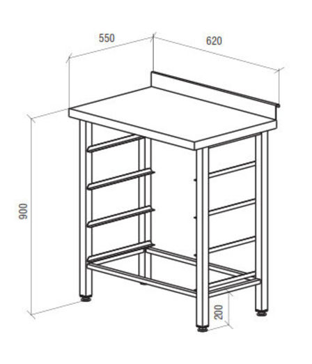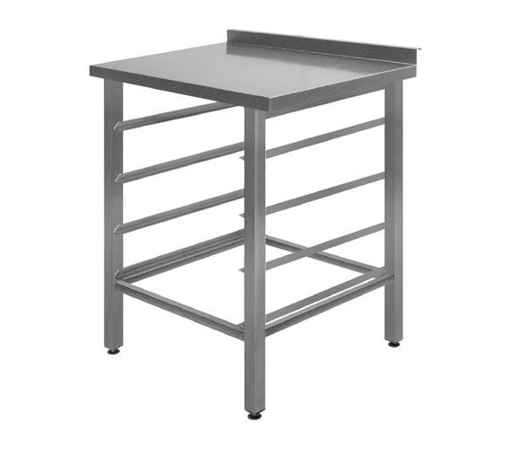 The working surface is made of stainless steel AISI 304. The guides for 4 dishwasher cassettes (500x500 mm) made of stainless steel AISI 304. Distance between the rails 145 mm. Stainless steel feet (square tube 40x40 mm). The legs are adjustable class="card__details" in height (amplitude of 35 mm, + 25 / -10 mm). There is a rear rim height - 50 mm.