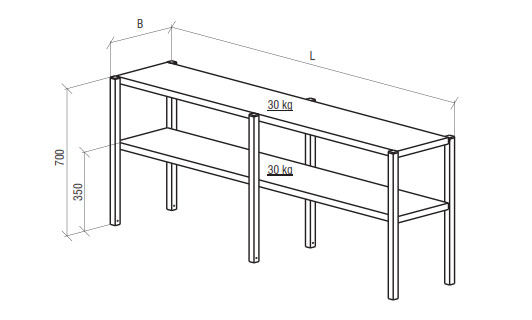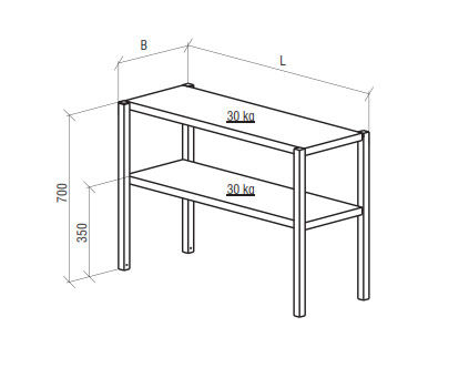 Shelf and frame made of stainless steel AISI 340; Can be used with all table class="card__details" models; Max loading 30 kg/shelf.