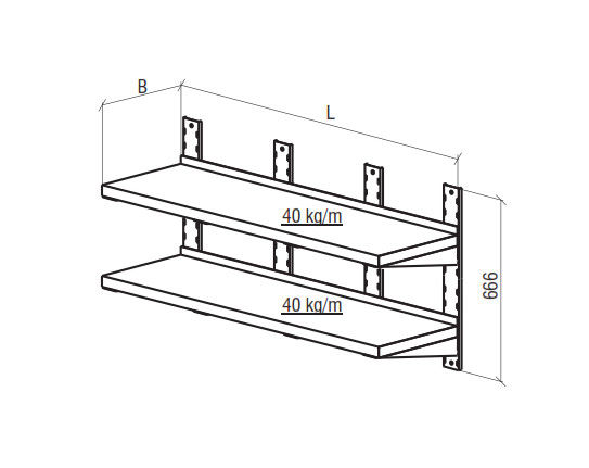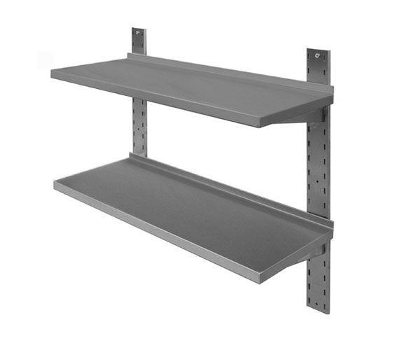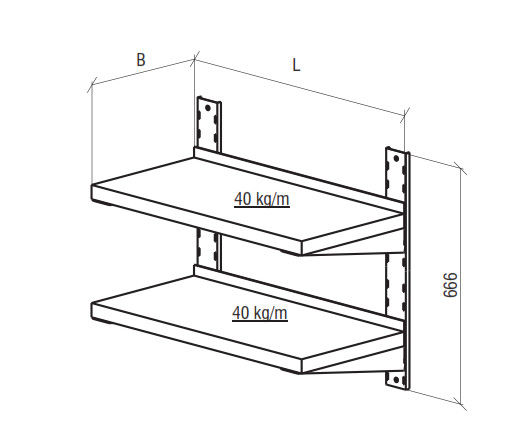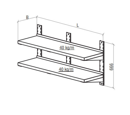 A shelfwall frames and bracketsis made from stainless steel AISI 304. Maximal loading on the shelf - 40kg/mThe height of shelf is regulated with the interval of 35mm.