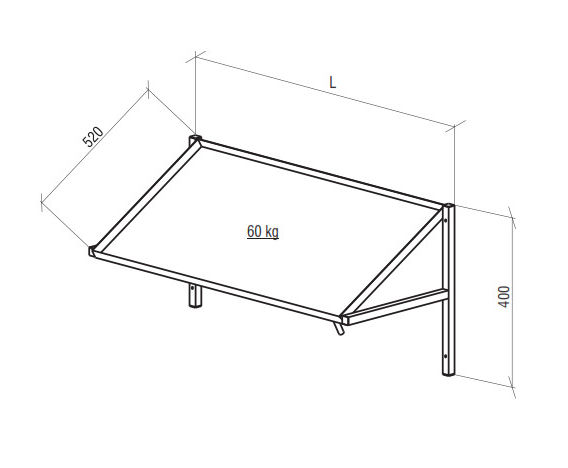 A shelf is made from stainless steel ANSI 304. Made from the square pipes of 25x25 mm. Maximal loading on the shelf is 60 kg.