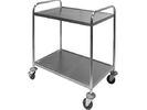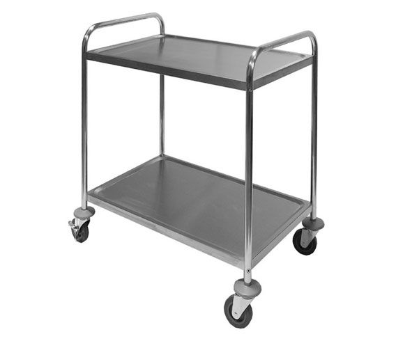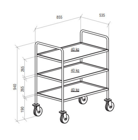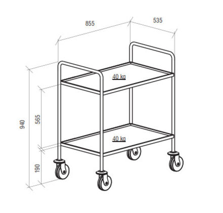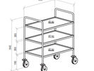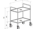 Frame of trolley and shelf executed from stainless steel AISI 304. Maximal loading on the shelf - 40 kg. Zincked wheels of 100 mm. 2 wheels with a stop device. 4 round plastic bumpers. Easy construction. A shelf is provided with noise isolation.