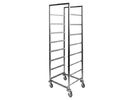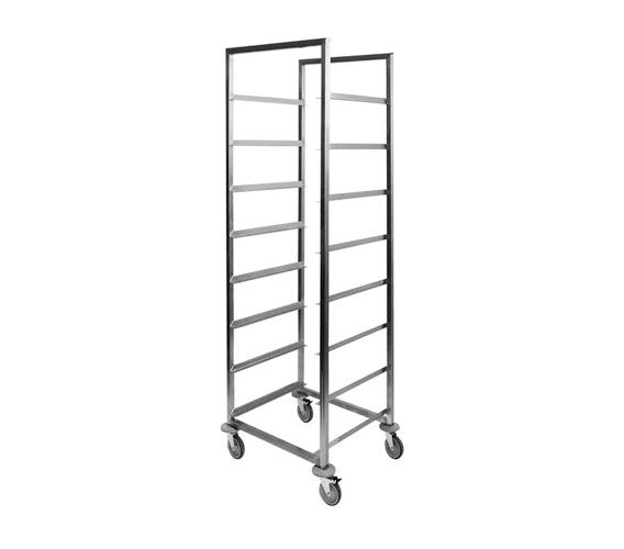 The frame of trolley is executed from stainless steel (square pipe of 25x25 mm). Zincked wheels of 100 mm -"Blickle" (Germany). 2 wheels with a stop device. 4 roundplastic bumpers.
