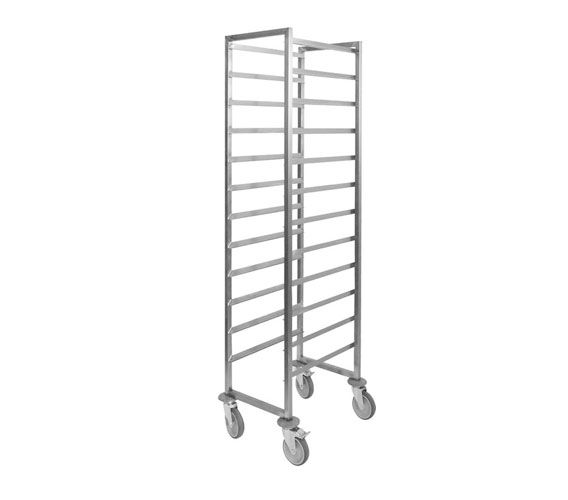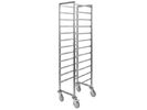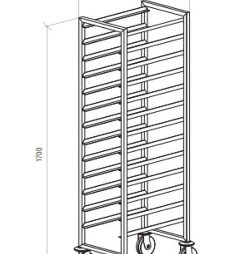 The frame of trolley is made from stainless steel (square pipe 25x25 mm). Zincked wheels of 100mm - "Blickle" (Germany). 2 wheels with a stop device. 4 round plastic bumpers.