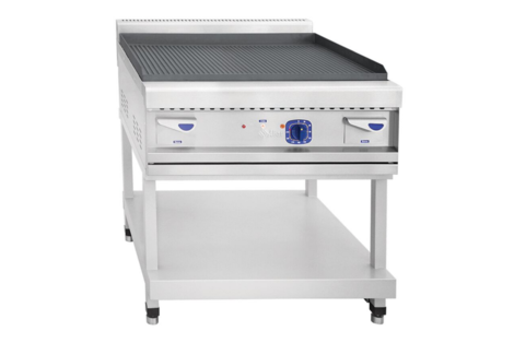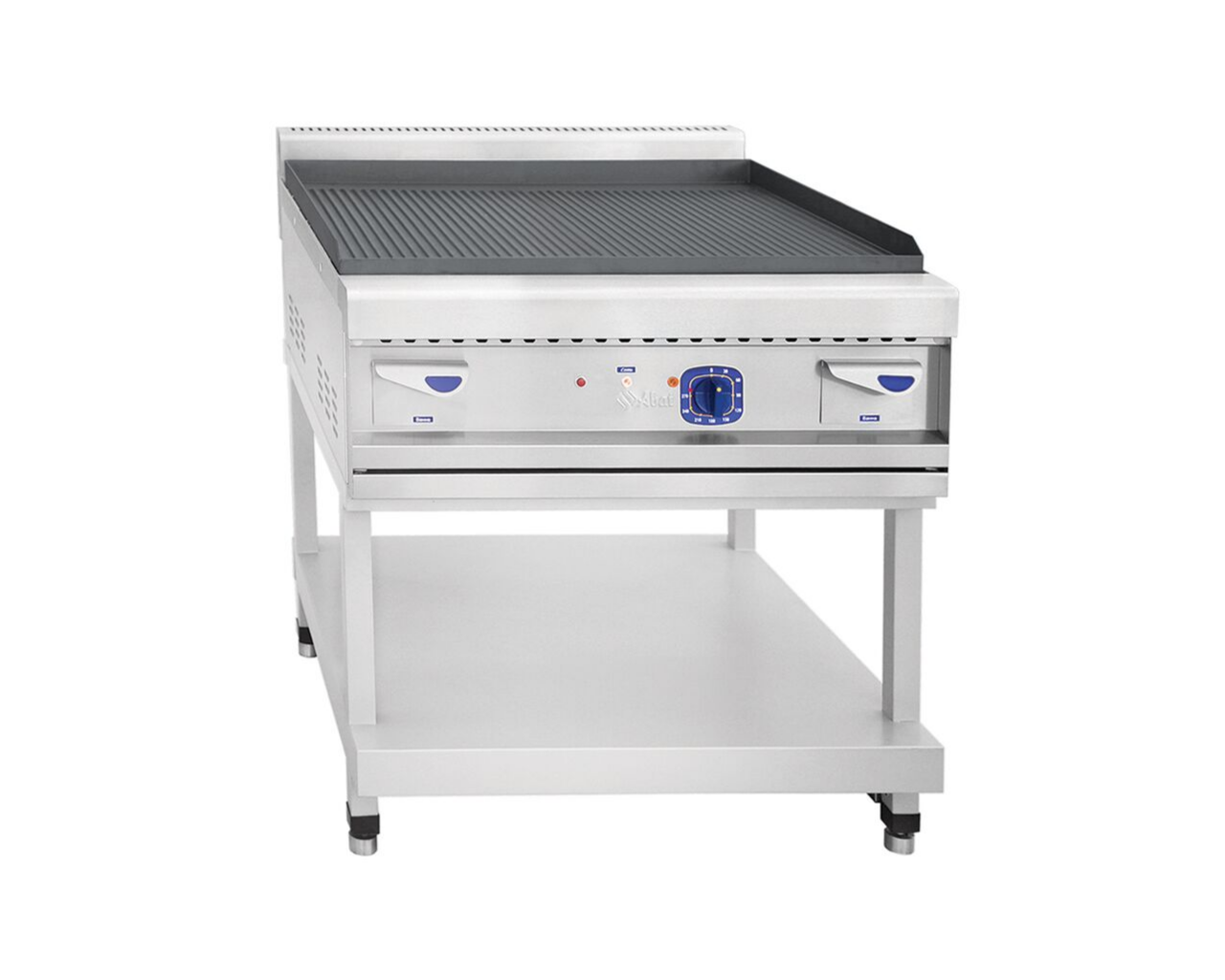 Elektriskā cepšanas virsma ABAT АКО-90P ar reljefainu tērauda virsmu 834x703 mm, 900. sērija, 840x900x950 mm, 12 kW, 400 V, statīvs ar plauktu, viss nerūsējošs. |