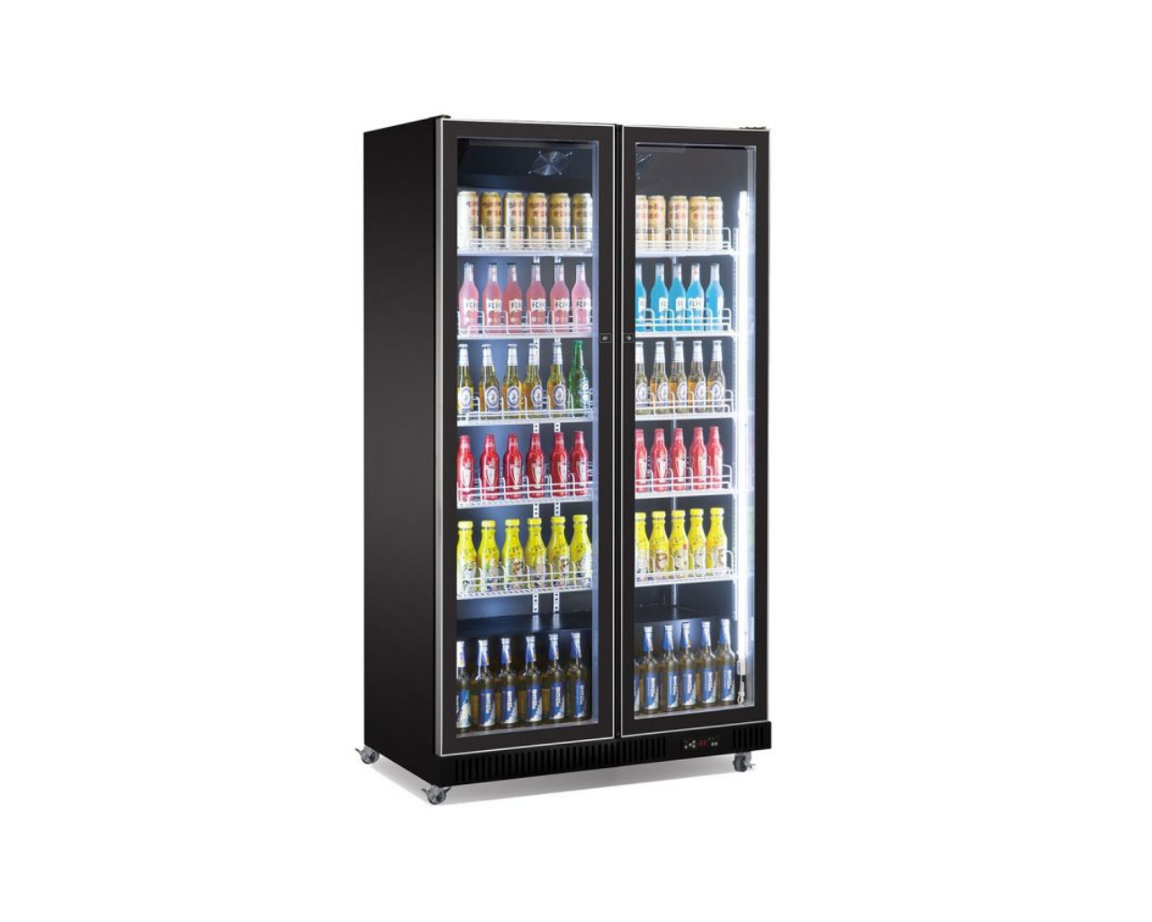 CombiSteel 7526.0010 MELNS ir divdurvju vitrīnas ledusskapis, kas apvieno elegantu dizainu un augstu funkcionalitāti, nodrošinot efektīvu dzērienu vai citu produktu uzglabāšanu un prezentāciju.