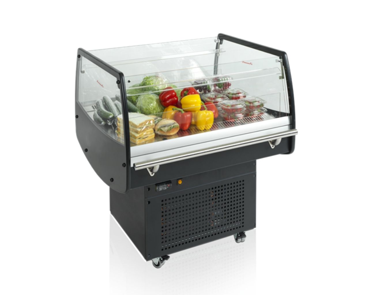 PDC90-P ir atvērta tipa promo vitrīna ar modernu dizainu, kas nodrošina ērtu piekļuvi produktiem un uzlabo to redzamību.
