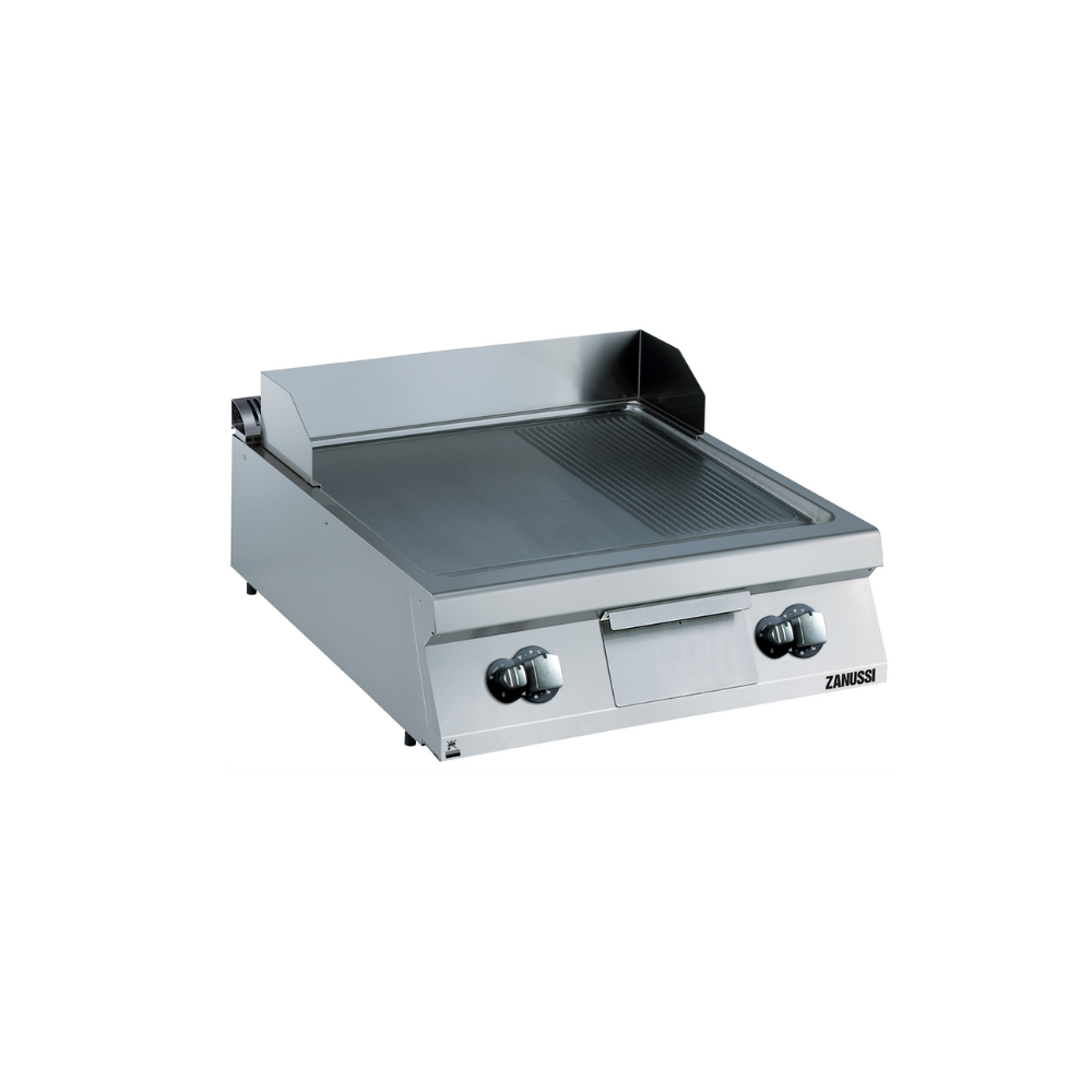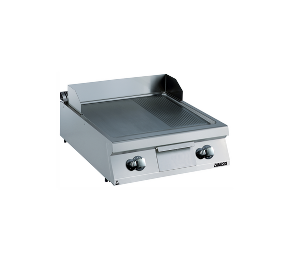 Pilna moduļa profesionāla gāzes cepšanas virsma, kas apvieno gludu un rievotu matētu hroma virsmu (2/3 gluda un 1/3 rievota). Šī kombinācija ļauj vienlaikus gatavot dažādus ēdienus ar maksimālu efektivitāti. Aprīkota ar slīpu virsmu, termostatisko vadību un jaudu 20 kW, šī ierīce ir piemērota intensīvai lietošanai profesionālās virtuvēs. Komplektā ietilpst speciāli skrāpji gan gludajai, gan rievotajai virsmai, lai nodrošinātu ērtu kopšanu.