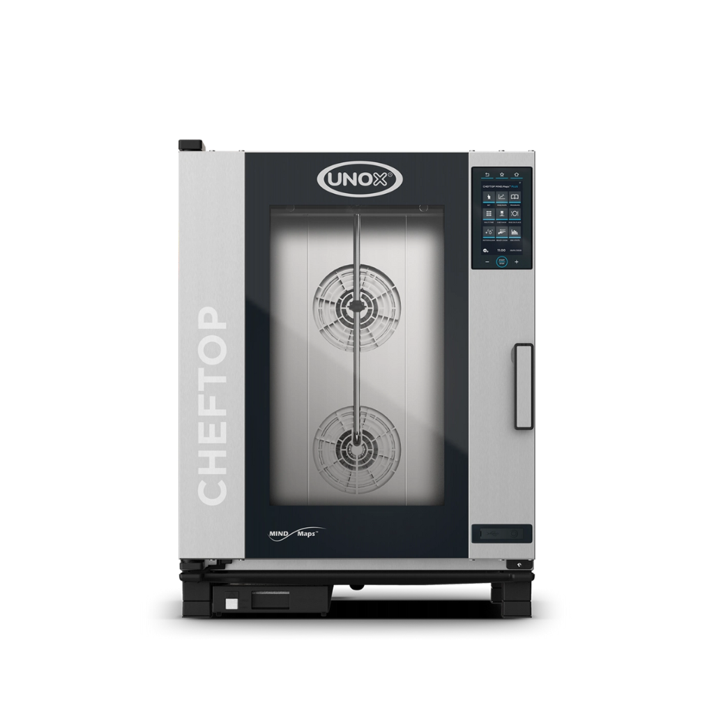 UNOX XEVC-1011-EPRM no CHEFTOP MIND.Maps™ PLUS sērijas ir viedā tvaika konvekcijas krāsns, kas piedāvā dažādas gatavošanas funkcijas, piemēram, cepšanu, sautēšanu, tvaicēšanu un daudz ko citu. Šī krāsns ir ideāli piemērota ēdināšanas iestādēm, tirdzniecības uzņēmumiem, maizes ceptuvēm un konditorejām, nodrošinot augstas kvalitātes cepšanu un gatavošanu.
