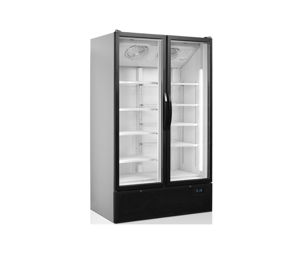 Серия FS не имеет подсветки верхней панели. Это позволяет увеличить внутреннюю высоту и придает шкафу более чистый вид. Такой двухдверный холодильный шкаф со стеклом является отличным выбором, когда не требуется подсветка верхней панели для брендирования. Поставляется с 5 регулируемыми белыми полками из проволоки, 2 самозакрывающимися откидными стеклянными дверями и 2 вертикальными светодиодными подсветками по всей длине внутри дверной рамы.