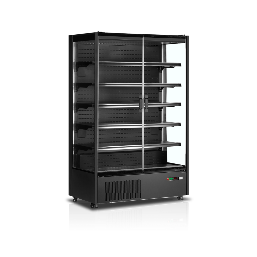 Вертикальная витрина со стеклянными распашными дверями и встроенным энергоэффективным холодильным агрегатом.
