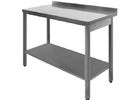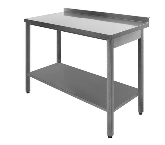 Рабочая поверхность из нержавеющей стали AISI 304 . Ноги изготовлены из нержавеющей стали (квадратная труба 40х40 mm). Ножки регулируются по высоте (амплитуда 35 мм). По необходимости стандартная высота (900 мм) может быть изменена. Стол длинной 2100-3500 мм имеет 6 ножек. Полка выполнена из нержавеющей стали AISI 304. Максимальная нагрузка на полку 80 кг.