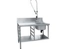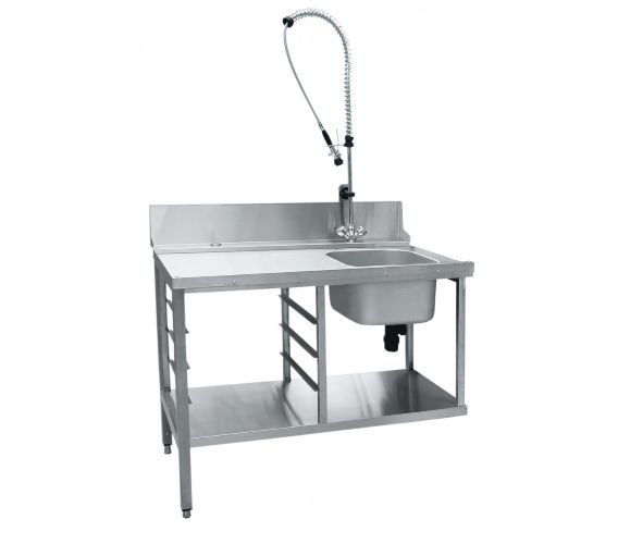 Имеет цельнотянутую ванну для предварительного ополаскивания посуды (400х400х250 мм), душирующее устройство для холодной и горячей воды, регулируемые по высоте ножки, направляющие для установки четырех кассет 500х500 мм. Крепление к посудомоечной машине осуществляется с помощью верхнего зацепа и нижних винтов. Путем несложного монтажа стол можно установить как в левом, так и правом исполнении.