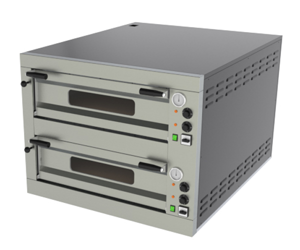 Каменная плита толщиной 14 mm. Передняя панель из нержавеющей стали. Термостат на 450 °C, два термометра, двойное внутреннее освещение для каждой камеры, 2 регулятора температуры для каждой камеры. Размер камеры - 700x1050x150 mm. Две камеры на 6 пиц диаметром 33 см каждая.