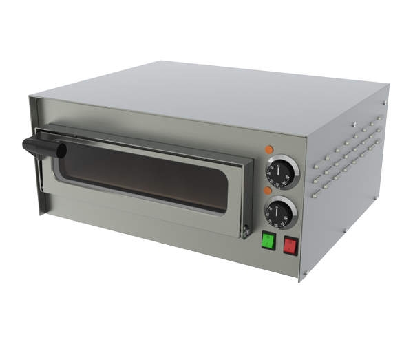 Термостат на 400 °C, таймер, 2 регулятора температуры. каменная плита. Размер камеры - 410x370x90 мм. Одна камера на 1 пиццу диаметром 35 см. Подходит для свежей пиццы. Внутренняя подсветка.