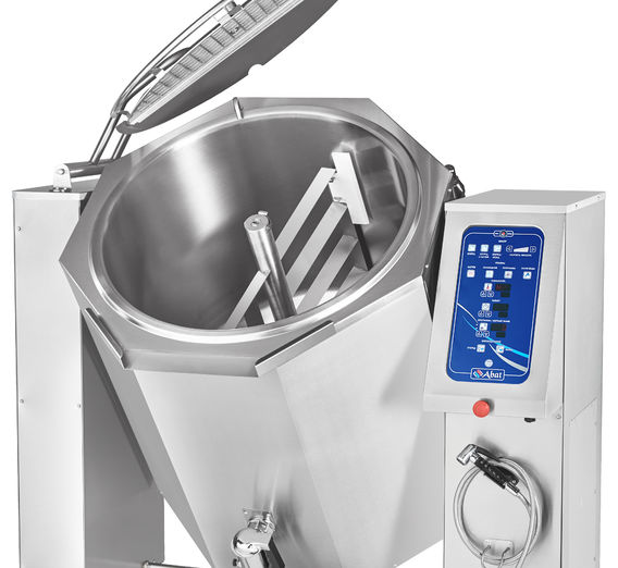 Котел оснащается простым и логичным пультом программного управления, который позволяет устанавливать все параметры готовки. КПЭМ-350-ОМ2 позволяет варить, перемешивать и охлаждать. Смеситель миксера имеет ступенчатую (10 шагов) регулировку скорости вращения от 0 до 120 оборотов в минуту, а также функцию реверса, что позволяет производить перемешивание и взбивание практически всех продуктов.