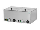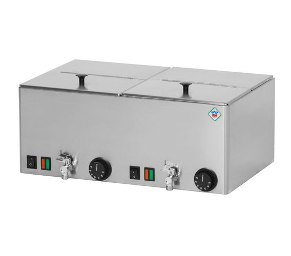 Мармит выполнен полностью из нержавеющей стали. Двойное дно. Контрольная лампочка. Два сливных крана. Вместимость - 2xGN 1/2 - глубиной 150mm.