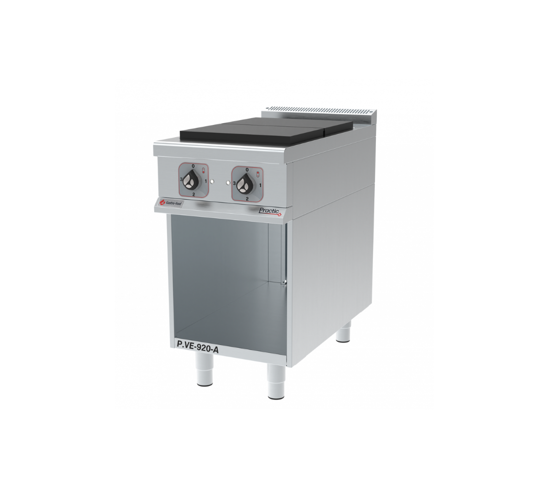 - Верхняя часть: плита, оснащённая двумя высокоэффективными электрическими конфорками 2×3 кВт, диаметр конфорок — 415 × 294 мм