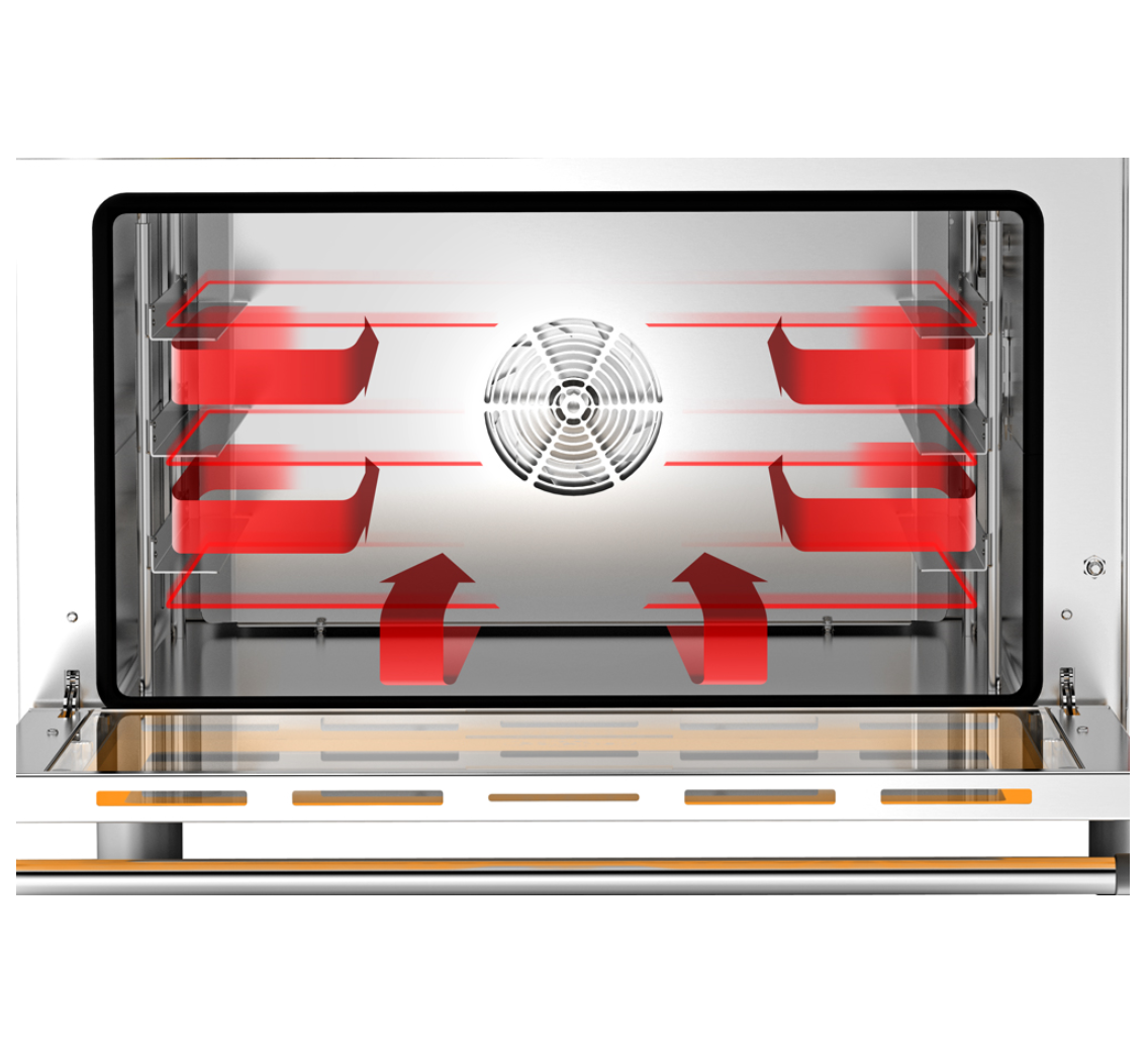 - спиралевидный ТЭН и крыльчатка роторного типа из нержавеющей стали обеспечивают эфективное и равномерное распределение горячего воздуха в камере духовки