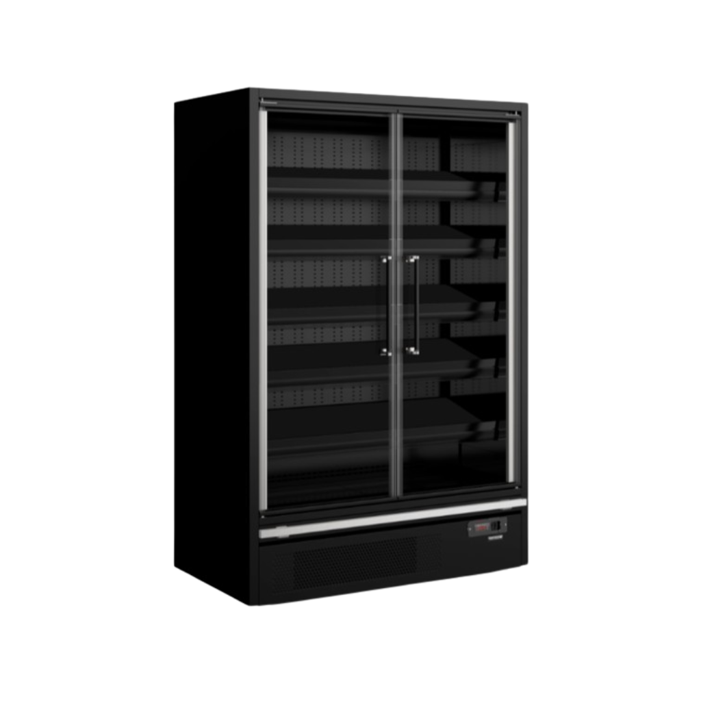 GALAXY+ GP14FGD BLACK ir vertikāla aukstuma vitrīna ar modernu dizainu, kas nodrošina izcilu produktu redzamību un efektīvu uzglabāšanu, padarot to ideāli piemērotu tirdzniecības vietām.