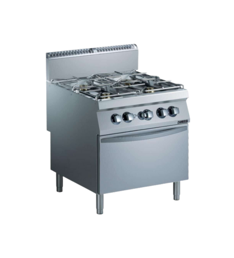 Profesionāla gāzes plīts ar cepeškrāsni, paredzēta vārīšanai, cepšanai un citu veidu produktu termiskai apstrādei.